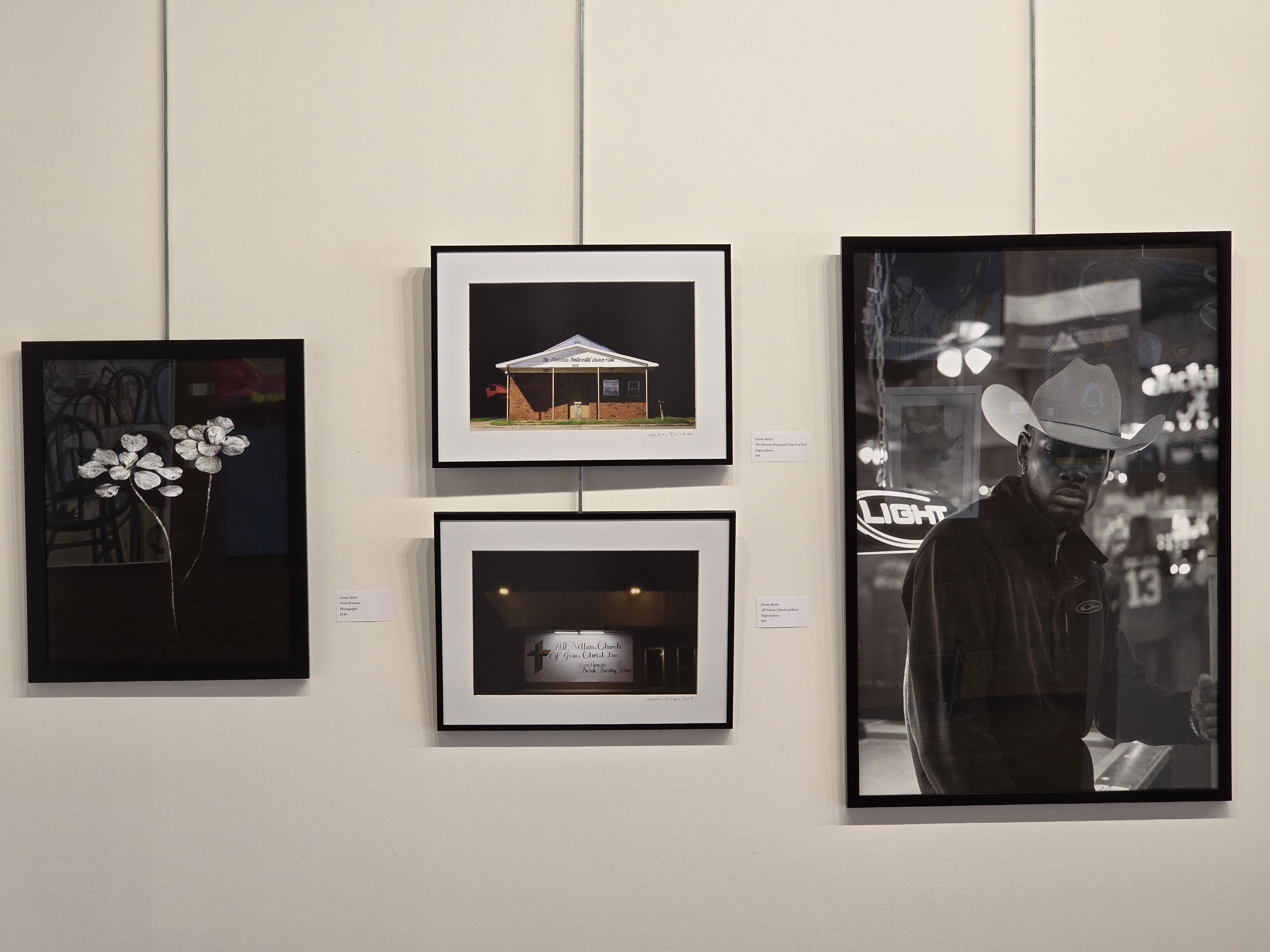 Group show: West Alabama Juried Show, January-February 2025, Dinah Washington Cultural Center, Tuscaloosa. Two photographs from the "Churches of Tuscaloosa County, at Night" project (see gallery wall above).